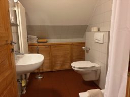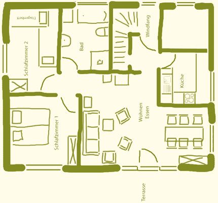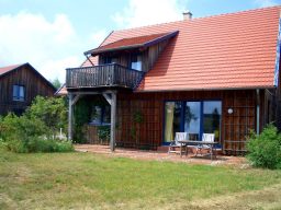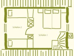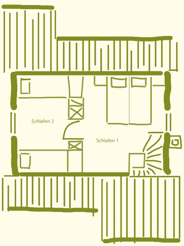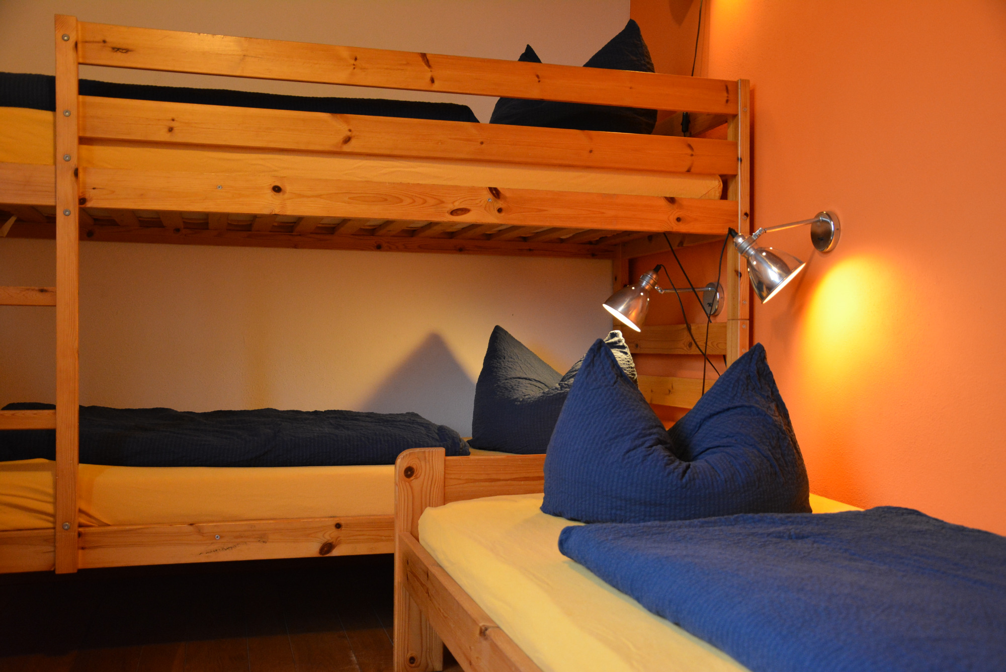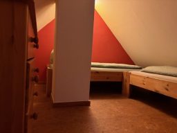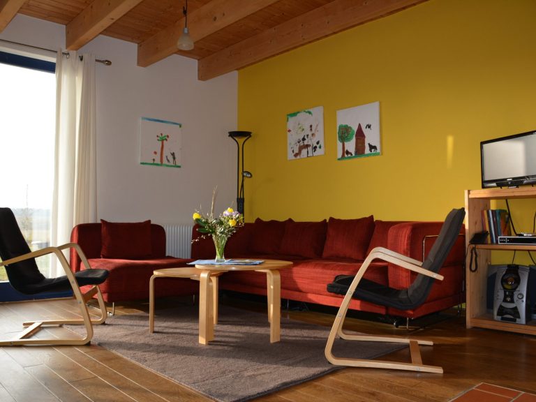 Die untere Etage dieses Hauses steht ihnen komplett zur Verfügung. Es gibt 2 Schlafzimmer, eines mit einem Doppelbett und eines mit 3 Betten, einem Etagenbett und einem Einzelbett. Durch ein Schlafsofa im Wohnbereich finden bis zu 7 Personen Platz. Zusätzlich befindet sich in diesem Haus noch unser Büro für und eine kleine Ferienwohnung für 4 Personen. Die Terrasse und das Gartengelände sind großzügig und offen.